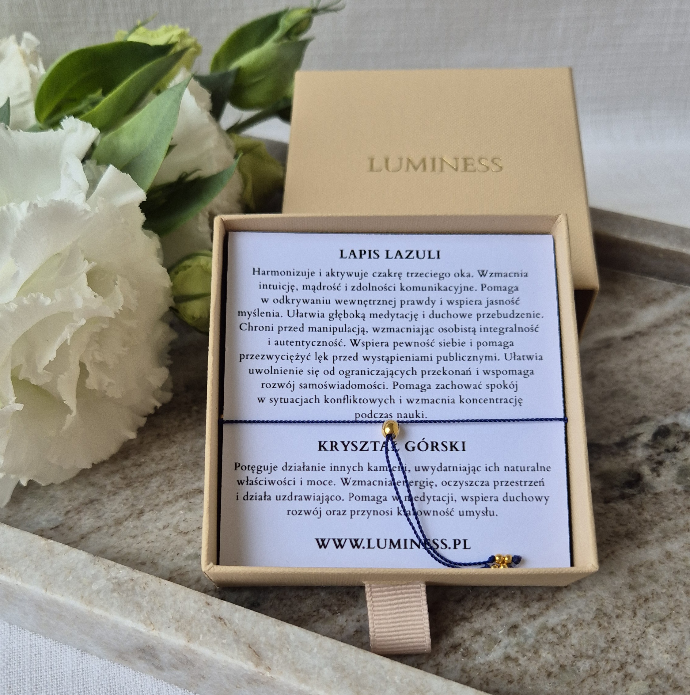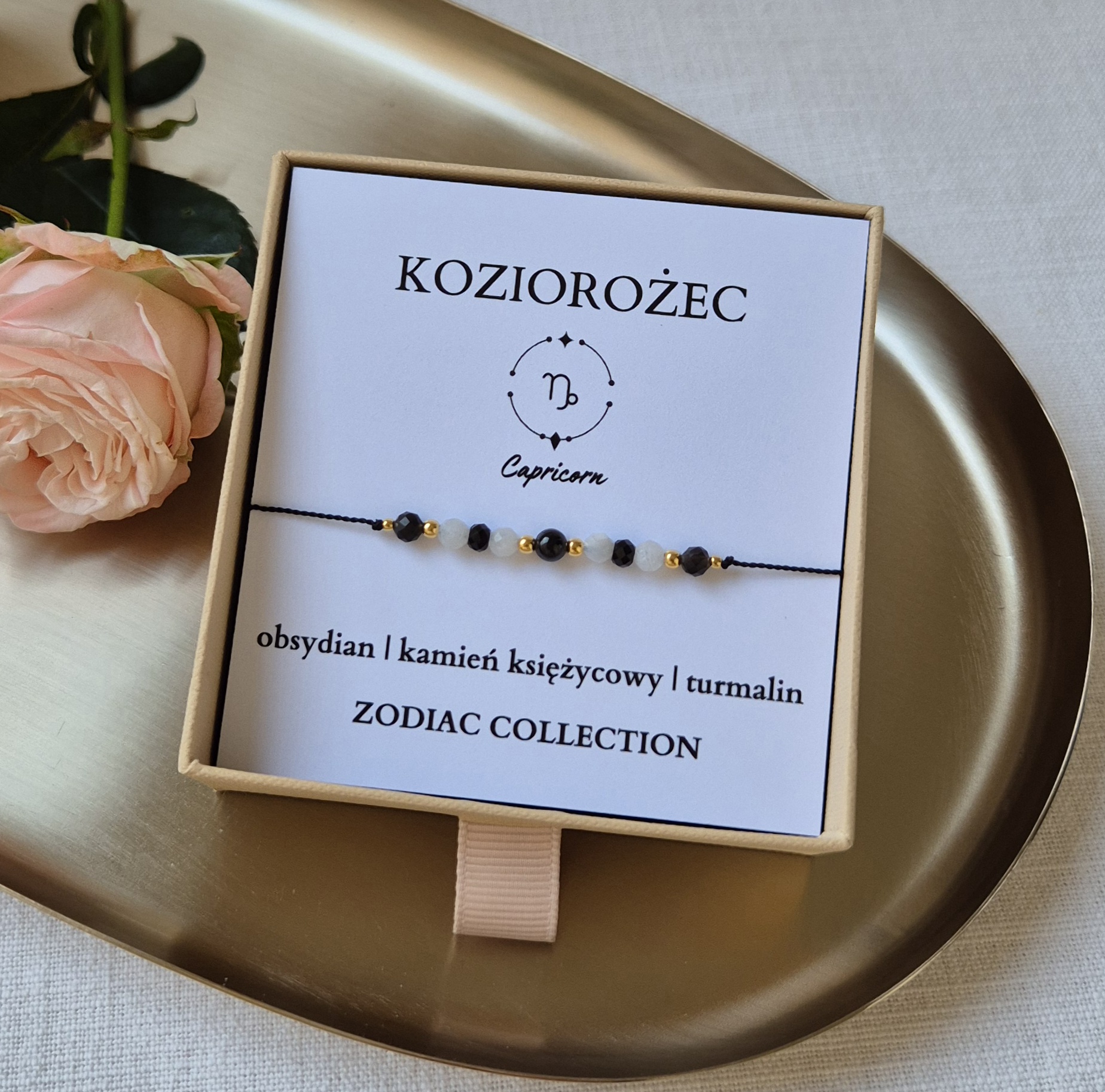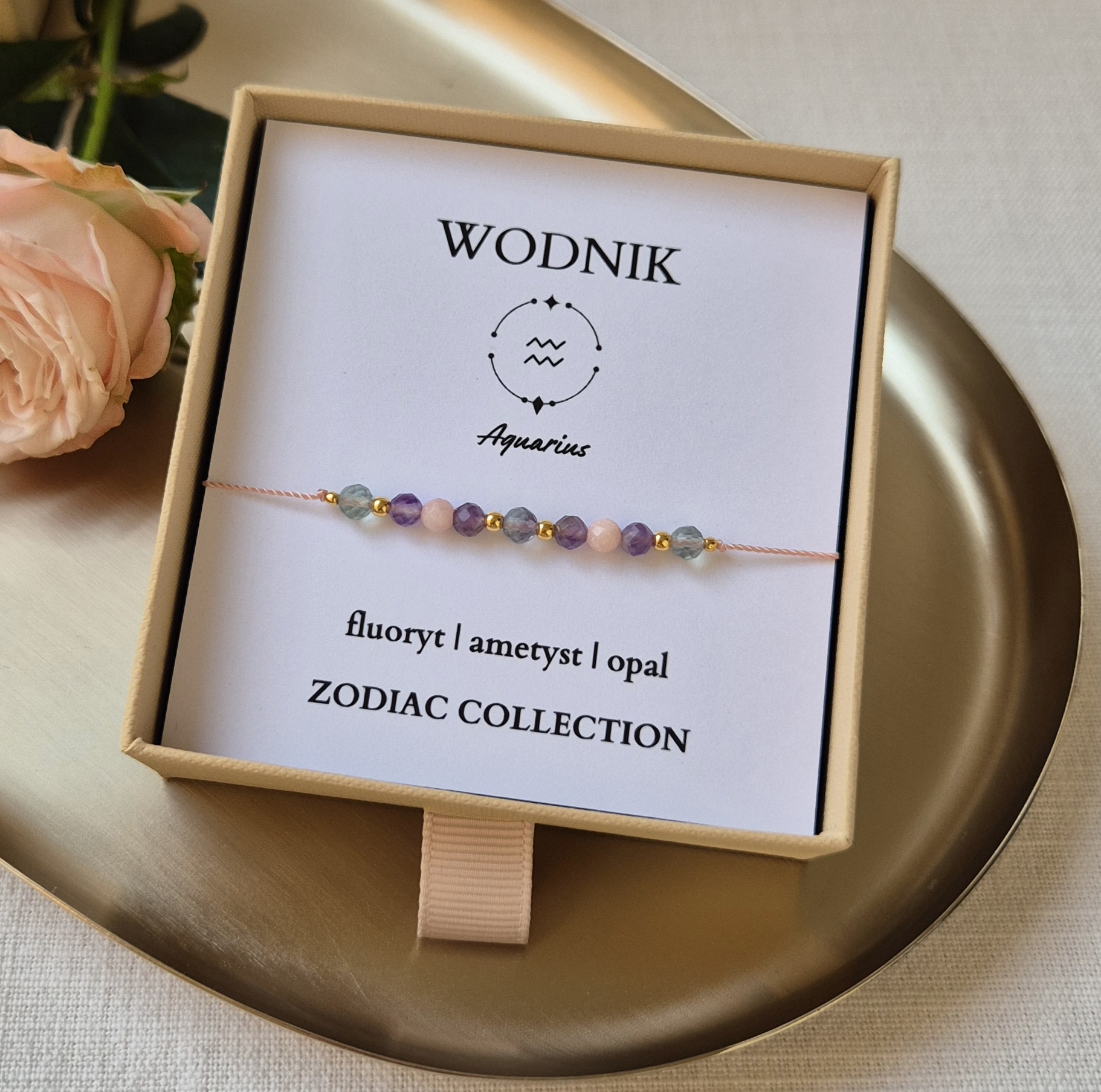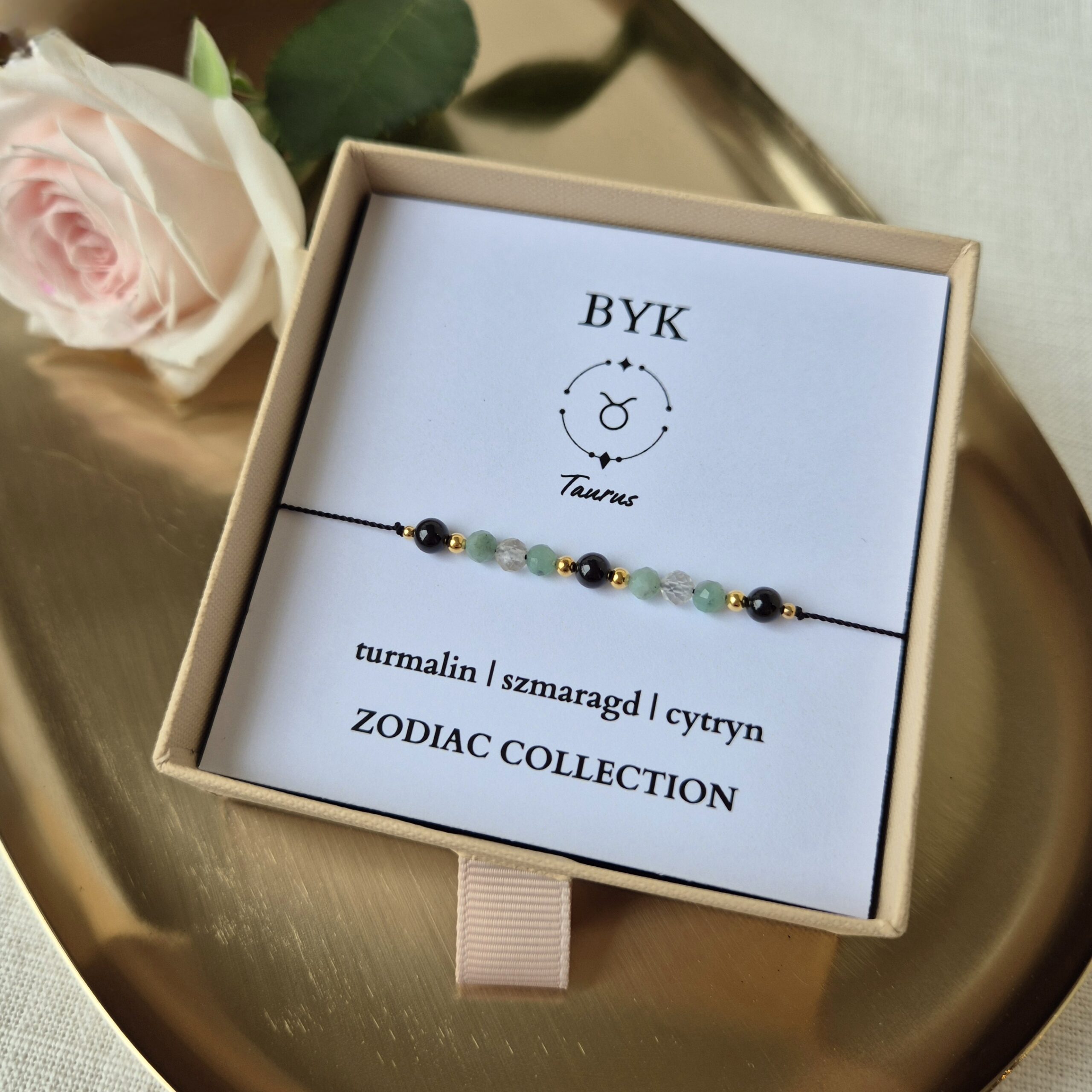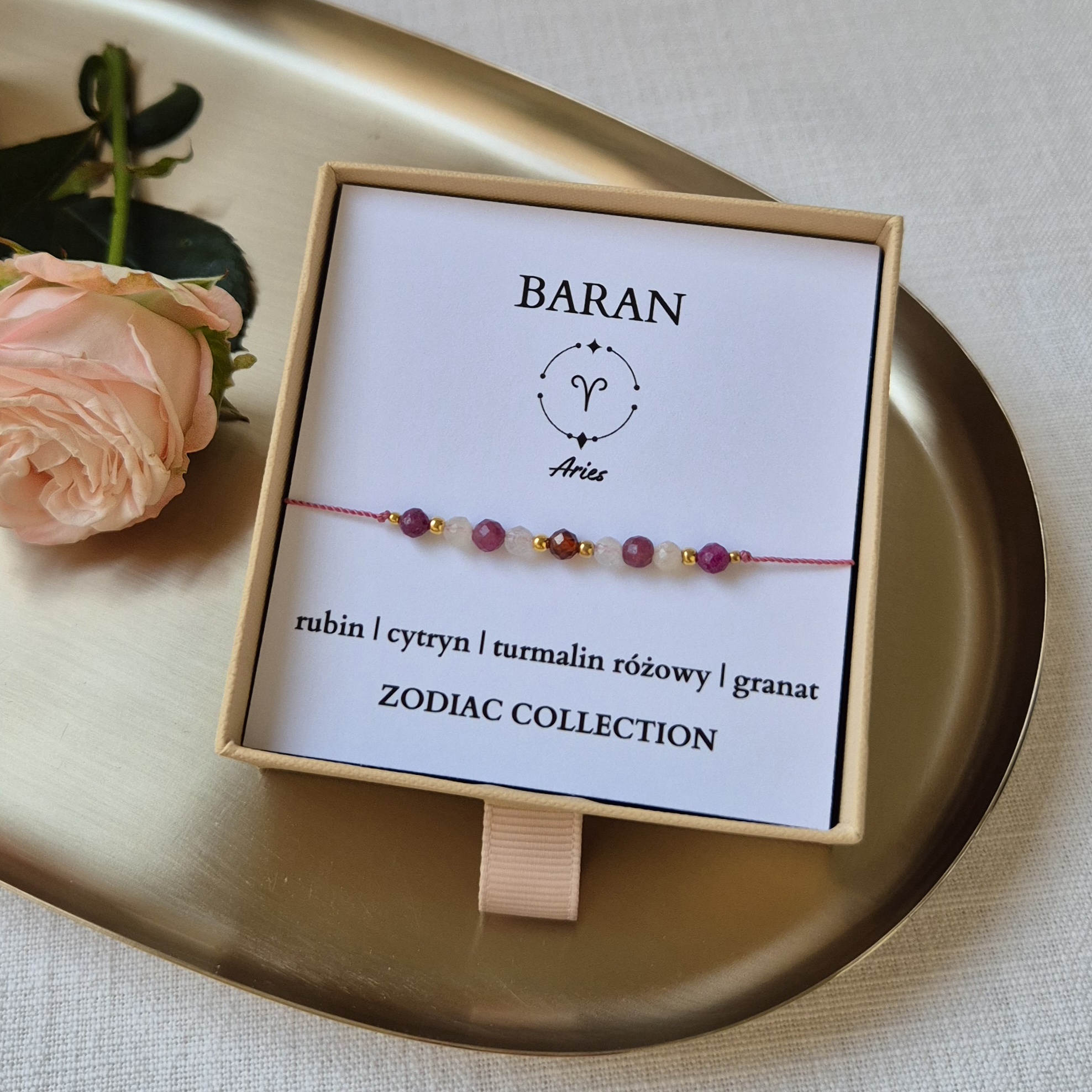 Każda bransoletka zapakowana jest w ekologiczne pudełko z miękkim wypełnieniem – do wyboru: beżowe lub różowe.