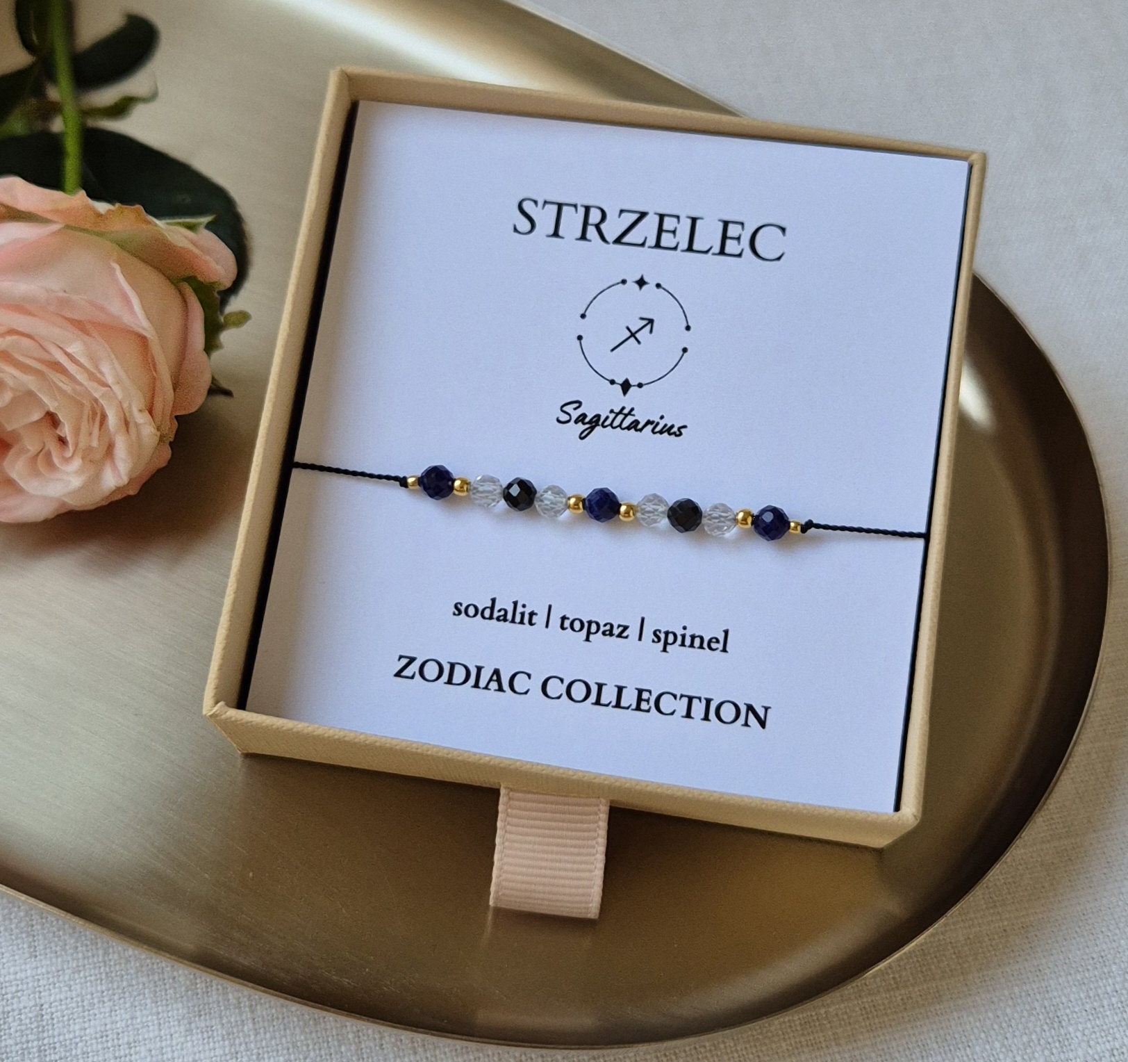 Każda bransoletka zapakowana jest w ekologiczne pudełko z miękkim wypełnieniem – do wyboru beżowe lub różowe.