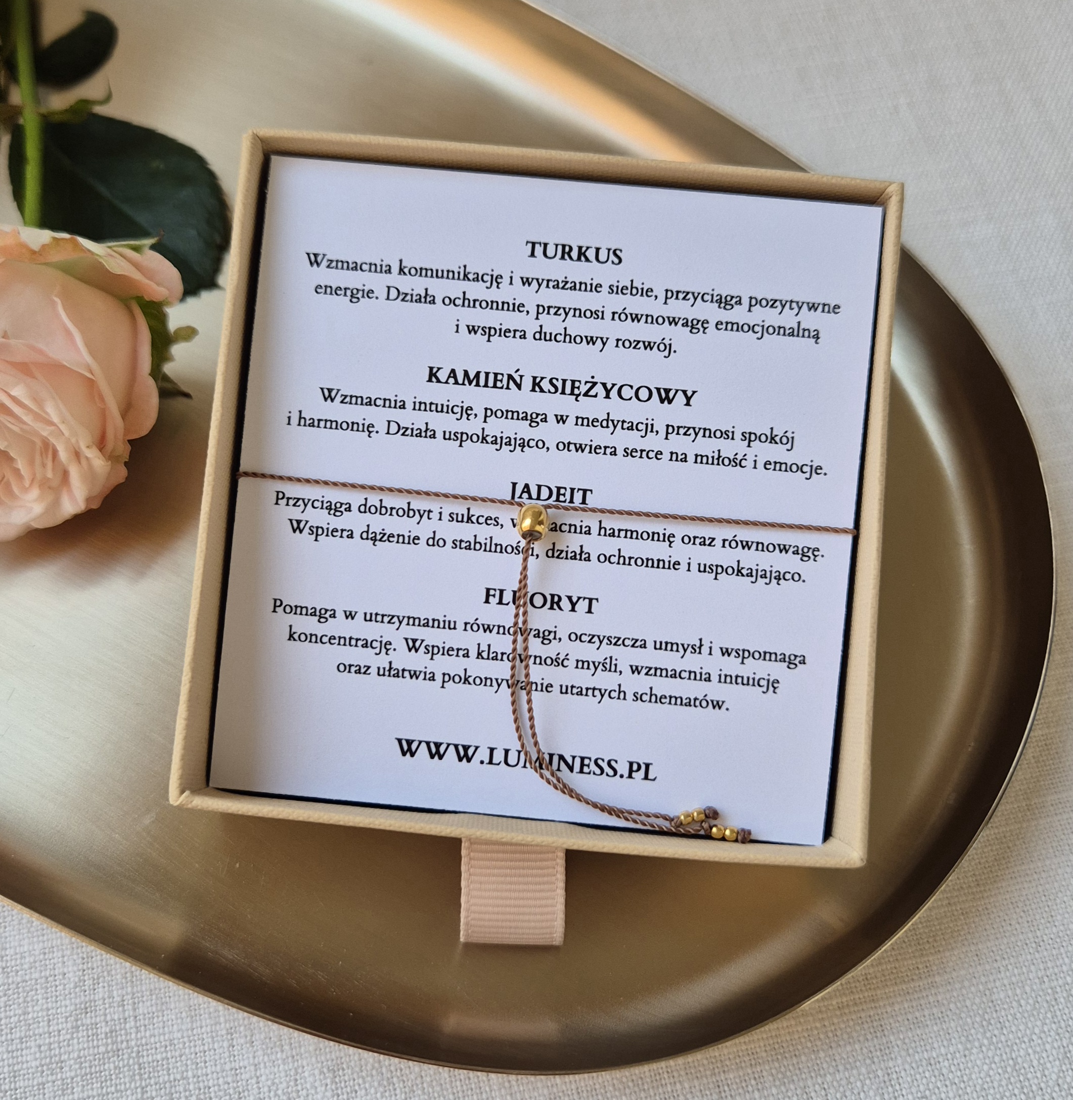 Każda bransoletka zapakowana jest w ekologiczne pudełko z miękkim wypełnieniem – do wyboru: beżowe lub różowe.