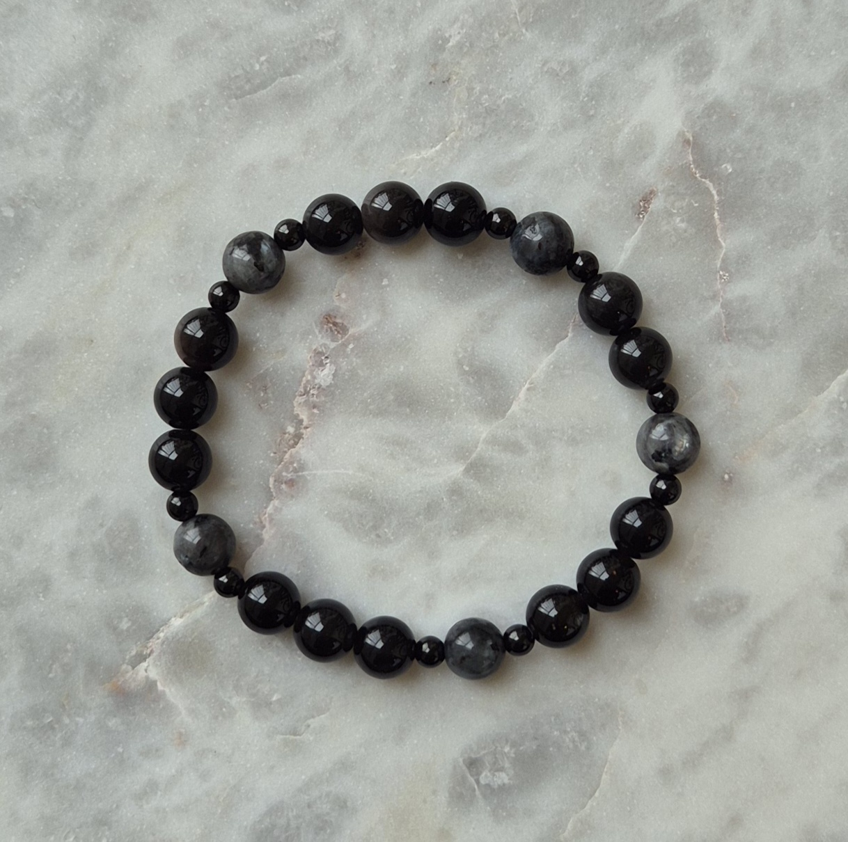Intuicja, ochrona, równowaga – bransoletka męska z larvikitem, turmalinem i obsydianem